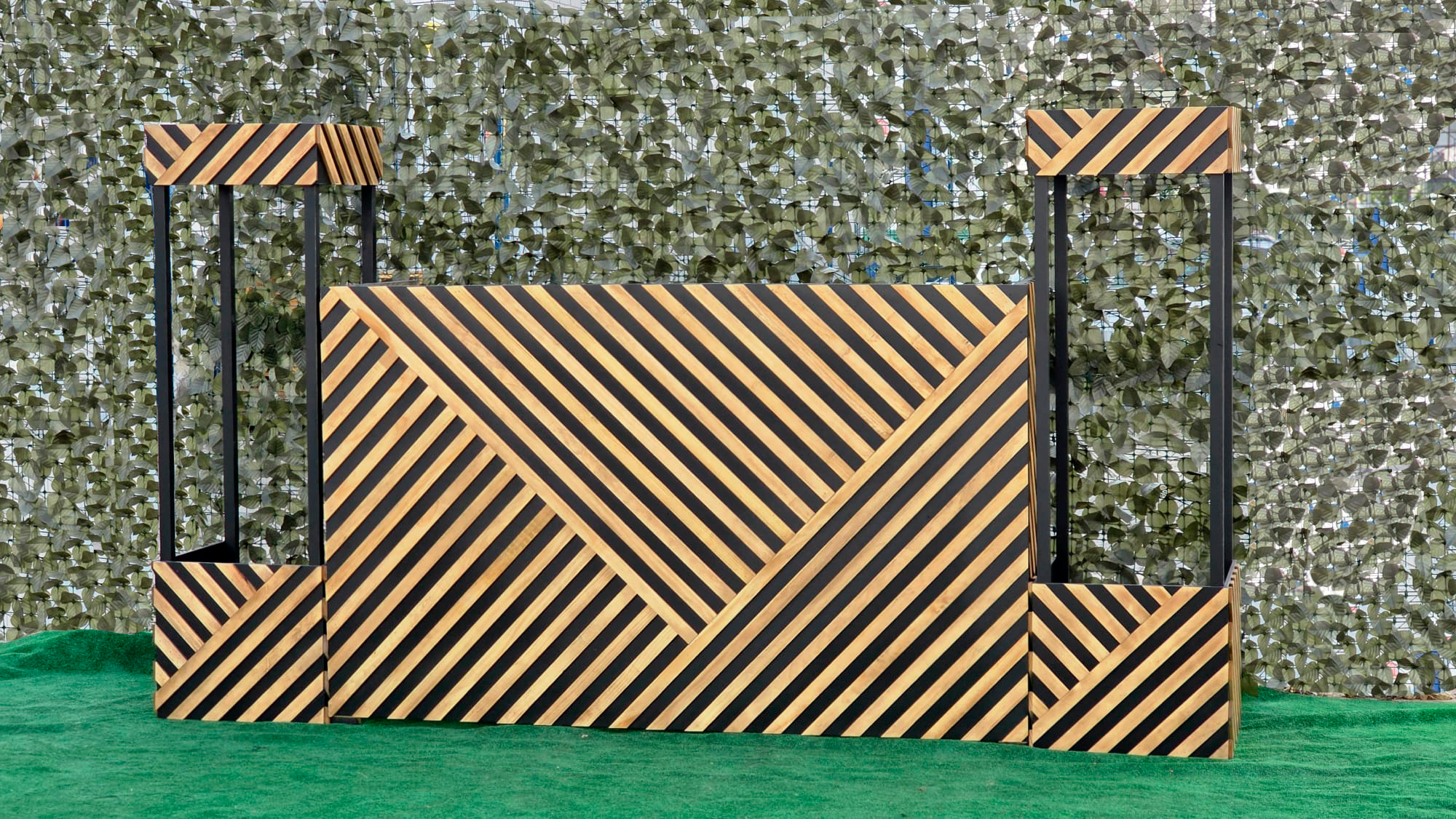 El acabado listado diagonal de la cabina no solo proporciona un aspecto estético único y llamativo, sino que también refleja la atención al detalle que caracteriza a Maderas Milmar. Este diseño dinámico aporta personalidad y modernidad, convirtiendo la cabina en un elemento central del evento.